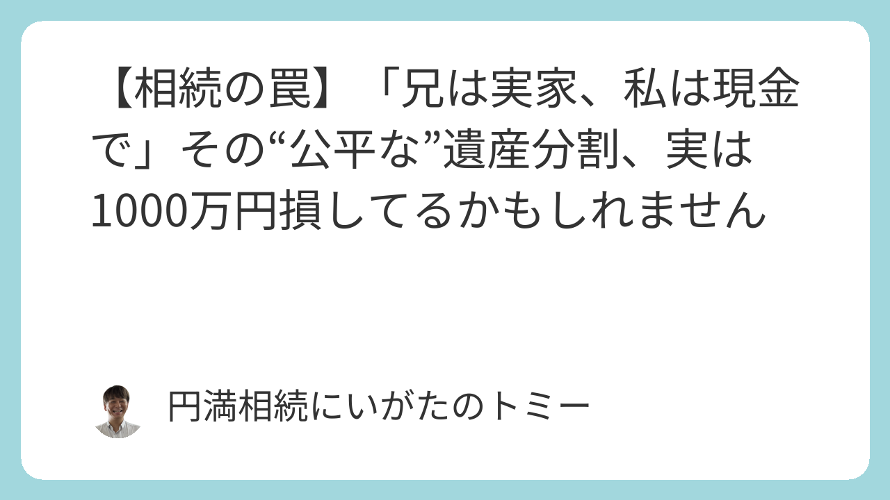 「実家の近くに住んでいるお兄ちゃんが、家と土地を相続すればいい。私は離れて暮らしているし、その分、現金をもらえればそれで満足だよ」